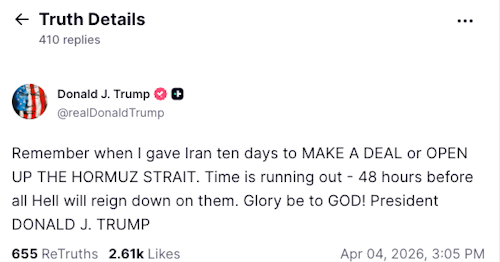 El presidente Donald J. Trump emitió este sábado una advertencia final a Irán en Truth Social, recordando que en 48 horas se vence el plazo para que el país acepte un acuerdo o proceda a la reapertura del estrecho de Ormuz.