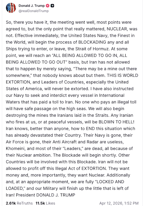 Donald Trump anunció que, de manera inmediata, la Marina de los Estados Unidos iniciará un bloqueo total de cualquier embarcación que intente entrar o salir del estrecho de Ormuz.