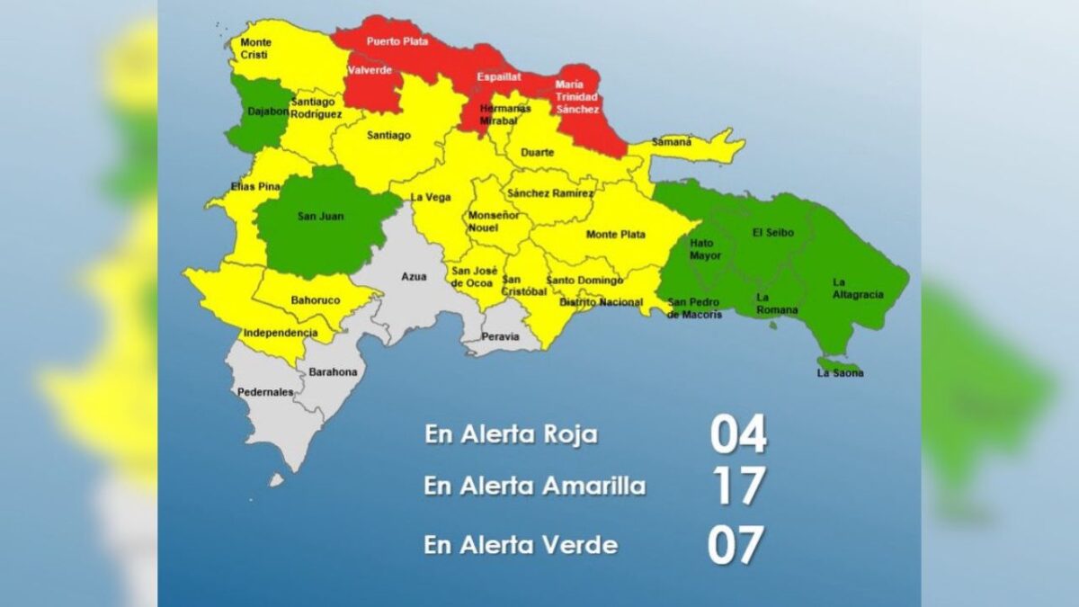 En ese sentido, el organismo mantiene 4 provincias en alerta roja; aumenta a 16 las provincias en alerta amarilla, junto al Distrito Nacional, y coloca 7 en alerta verde, debido a que continuarán desplazándose campos nubosos generadores de lluvias fuertes, tormentas eléctricas, ráfagas de viento y posibles granizadas, especialmente en zonas cercanas a sistemas montañosos.