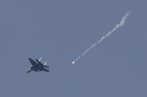Un avión F-15 israelí lanza una bengala mientras sobrevuela el sur del Líbano, cerca de la frontera entre Israel y el Líbano, visto desde el lado israelí de la frontera en el norte de Israel, el 13 de abril de 2026. Reuters/Florion Goga.