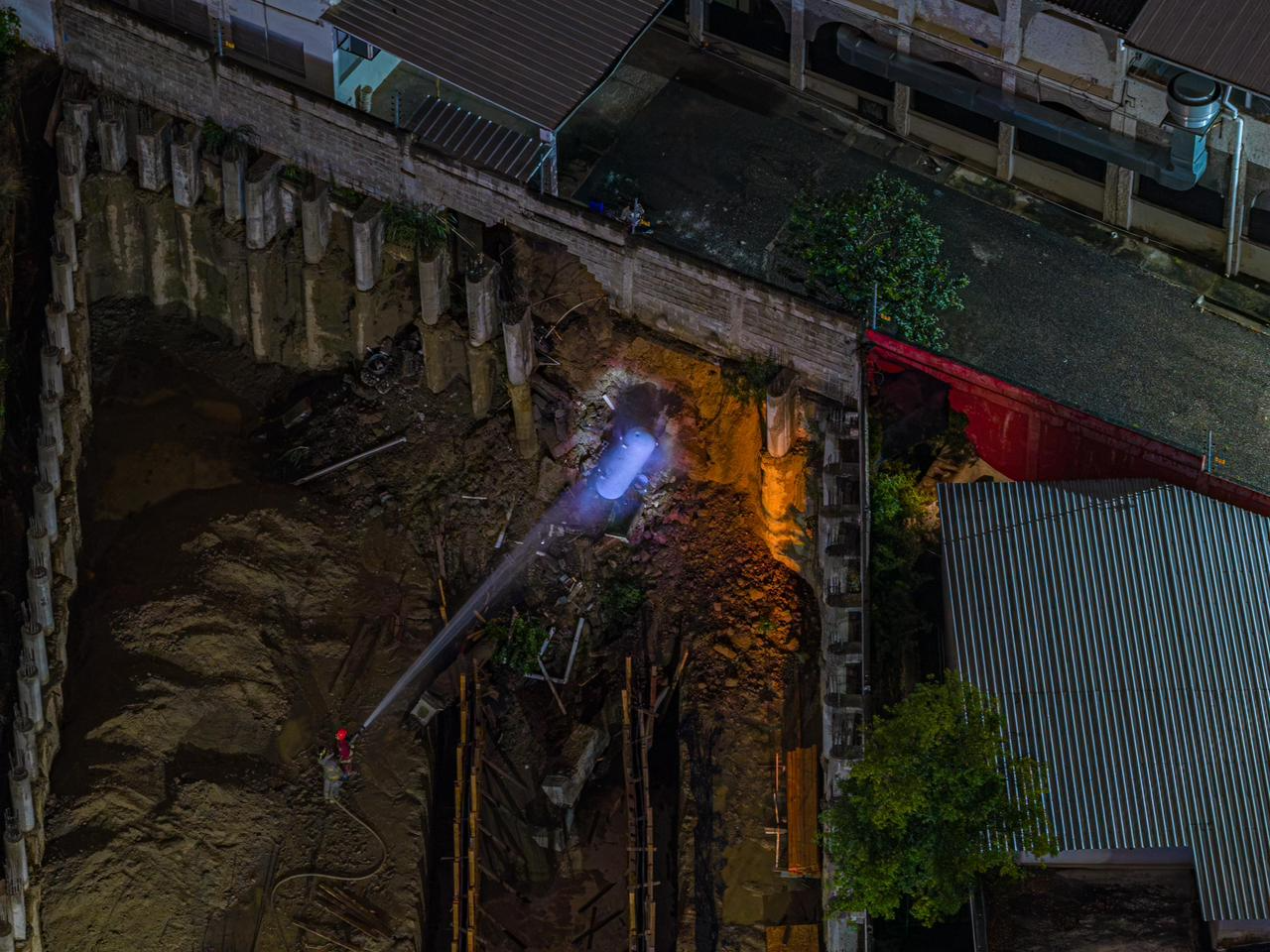 El derrumbe impactó un tanque de gas de uso utilitario de 120 galones, lo que generó una fuga de gas que movilizó de inmediato a las unidades de emergencia del Cuerpo de Bomberos de Santiago.