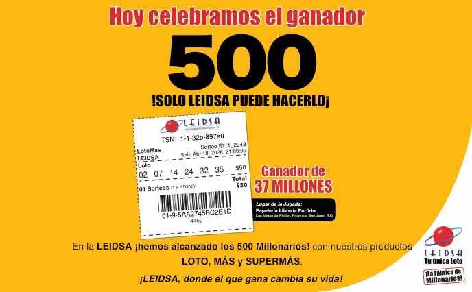 Santo Domingo.- La Lotería Electrónica Internacional Dominicana, S. A. (LEIDSA) informó que, en el sorteo del pasado sábado 18 de abril, resultó el millonario número 500, con un premio de 37 millones de pesos.
