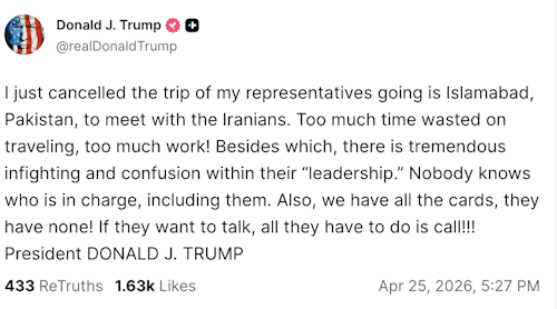 En su red social Truth Social, Trump confirma que canceló el viaje de sus representantes a Islamabad para reunirse con los iraníes. El mandatario justificó la decisión alegando «demasiado tiempo perdido en viajes» y señaló que existe «una tremenda lucha interna y confusión» en el liderazgo iraní. «Nadie sabe quién está al mando, incluidos ellos», escribió Trump, quien añadió que Estados Unidos «tiene todas las cartas» y que si Irán quiere hablar, «solo tiene que llamar».