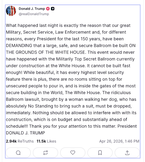 “Lo que ocurrió anoche es exactamente la razón por la que nuestras magníficas Fuerzas Armadas, el Servicio Secreto, las fuerzas del orden y, por diferentes motivos, todos los presidentes de los últimos 150 años, han estado EXIGIENDO que se construya un salón de baile amplio, seguro y protegido en los terrenos de la Casa Blanca”, escribió en la red Truth Social.