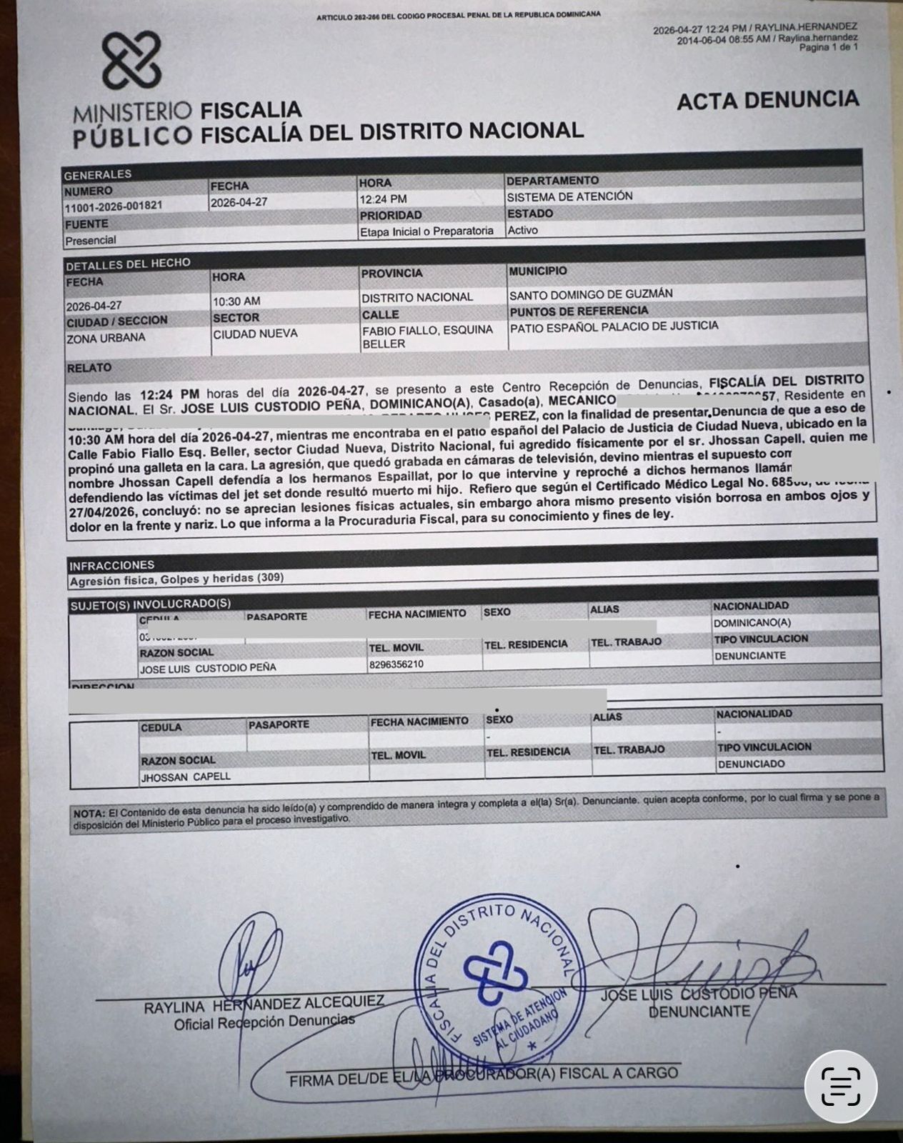 El señor José Luís Custodio padre de unas de las víctimas del derrumbe de la discoteca Jet Set, denunció este lunes al comunicador Jhossan Capell por agredirlo fisicamente en la sede del Palacio de Justica de Ciudad Nueva durante la audiencia preliminar que se le sigue a los hermanos Maribel y Antonio Espaillat por el colapso del establecimiento.