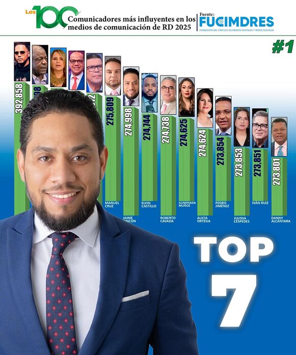 El ranking presentado por la entidad que preside Kelvin Ortiz Faña evaluó los cien comunicadores más influyentes del país, ocupando Rincón el séptimo puesto.