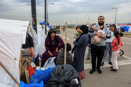 Mohamad Al Badran posa con su familia, tras huir de los suburbios del sur de Beirut, en un campamento provisional para desplazados, en medio de la escalada de hostilidades entre Israel y Hezbolá, mientras continúa el conflicto entre Estados Unidos, Israel e Irán, en Beirut, Líbano, el 1 de abril de 2026. Reuters/Raghed Waked.