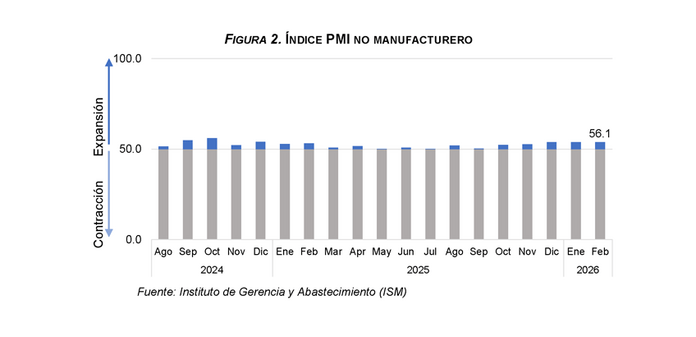 En este sentido, el desempleo general en los Estados Unidos se ubicó en 4.4 % en febrero, ligeramente por encima del 4.3 % registrado en enero de 2026, con una pérdida neta de 92,000 empleos. En el caso de la población latina, la tasa de desempleo alcanzó 5.2 %, aumentando desde el 4.9 % observado en enero. No obstante, el índice de gestores de compras (PMI, por sus siglas en inglés) no manufacturero del Instituto de Gerencia y Abastecimiento (ISM) registró un valor de 56.1 en febrero, superior al 53.8 de enero, lo que indica una expansión del sector servicios. Este sector concentra una proporción importante del empleo de la diáspora dominicana, lo que contribuyó a amortiguar parcialmente la caída del empleo.