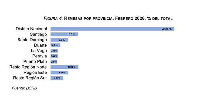 Respecto a la distribución de las remesas recibidas por provincias, el BCRD señala que el Distrito Nacional recibió una proporción del 48.0 % durante febrero, seguido por las provincias de Santiago y Santo Domingo, con un 10.5 % y 6.6 %, respectivamente. Esto indica que casi dos tercios (65.1 %) de las remesas se recibe en las zonas metropolitanas del país.