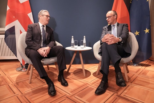 En los márgenes de la Conferencia de Seguridad de Múnich, el canciller alemán recibió a su contraparte británico para una reunión bilateral y, antes del inicio de la misma, mientras la prensa capturaba el momento, Merz bromeó: «Espero que no te importe la bandera europea», en una referencia velada al Brexit.